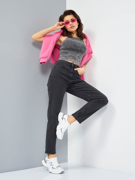 Женские модные джинсы с пятью карманами. Посадка Mom fit (высокая талия), свободные в бедре и зауженные к низу, укороченной длины. Застежка на молнию. Выполнены из слабоэластичной ткани denim comfort stretch, цвет ткани Black/Black (лицевая и изнаночная стороны ткани черные). Классическая темная стирка с потёртостями только по швам.