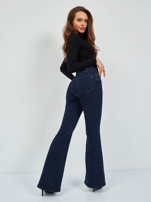 Женские джинсы с пятью карманами. Посадка Slim flare fit (облегающие по бедру и расклешенные от колена), высокая талия. Для улучшения посадки по талии сделан подкройной пояс из 2-х частей. Застежка на молнии. Выполнены из эластичной ткани denim stretch, цвет ткани Blue/Black(лицевая сторона ткани темно-синяя, изнаночная сторона- черная). Классическая темная стирка с потёртостями только по швам.