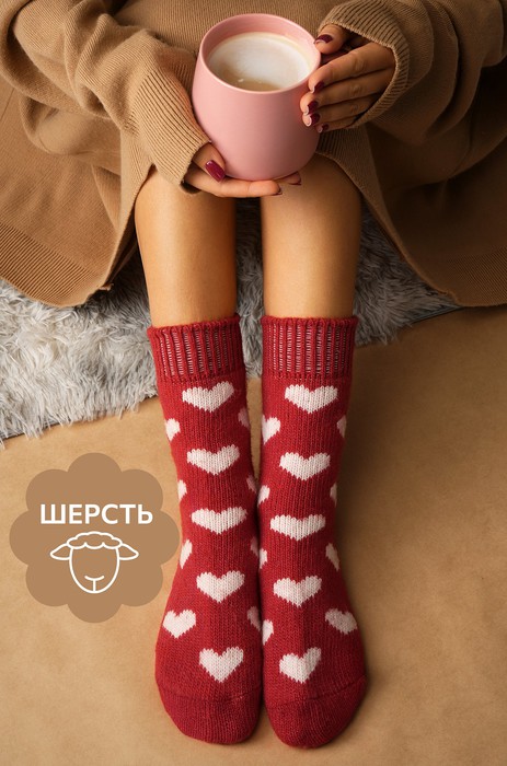 Уютные носочки для зимы! Красные шерстяные носки с рисунком Сердечки подарят тепло и нежность в холодные дни. Высокие женские носки связаны из мягкой шерсти и отлично держат тепло.
