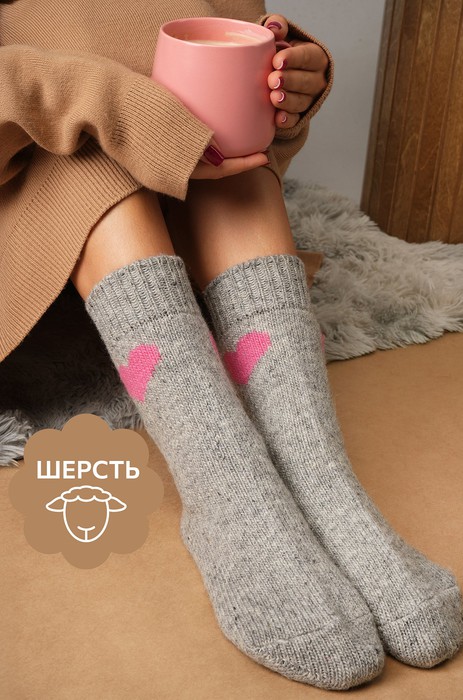 Уютные носочки для зимы! Серые шерстяные носки с рисунком Сердечко подарят тепло и нежность в холодные дни. Высокие женские носки связаны из мягкой шерсти и отлично держат тепло.