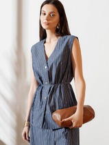 27.03 Vilatte Удлиненный костюмный жилет в полоску с поясом из легкого хлопково