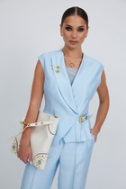 Жилет прямого кроя выполнен из текстильного полотна черного цвета. Характеристики: укороченный, однобортный, прямой крой, брендированная подкладка, застежка центральная на петли - пуговицы, низ изделия по переду с фигурным низом. Длина по спинке от края горловины 36 см