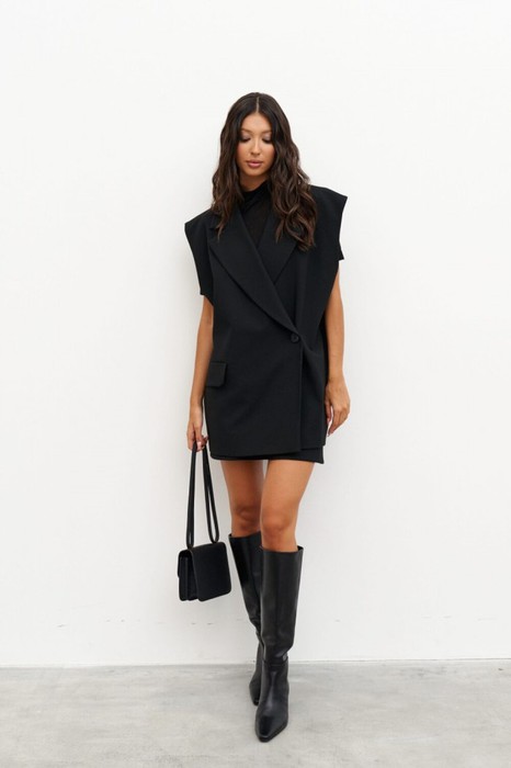 Жилет однобортный. Выполнен из костюмной ткани чёрного цвета Прямой крой, подклад, воротник отложной с широким лацканом, линия плеча спущенная. Застёжка смещённая - на одну пуговицу. Карман с клапаном (функциональный). Длина спинки жилета 76 см.