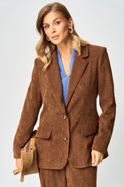 Жакет женский, прямого силуэта, укороченный, на подкладке. Выполнен из текстильной, фактурной ткани серого цвета, рисунок елочка. Характеристика: горловина стойка с хлястиком, застегивается на петлю с пуговицей. Застежка центральная бортовая, застегивающаяся на петли, пуговицы. Подплечники. Брендированная подкладка. Рукав втачной двухшовный, по низу рукава вставлена рюша из тонкой хлопковой ткани. Рюша притачная. По низу рукава нашиты пуговицы. Спинка с двумя рельефными швами. Длина жакета по спинке 43 см. Длина рукава без рюши 63 см.