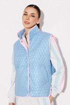 Жилет прямого силуэта без рукавов. Полочка с центральной застежкой на кнопки и карманом-листочкой. Спинка с фигурной кокеткой и рельефами по кокетке, а также с тесьмой от кокетки с логотипом "BUTER". Воротник-стойка. Полочка и спинка с фигурным низом. Полочка, спинка, пройма, воротник окантованы хлопковой тесьмой. Жилет на подкладке.