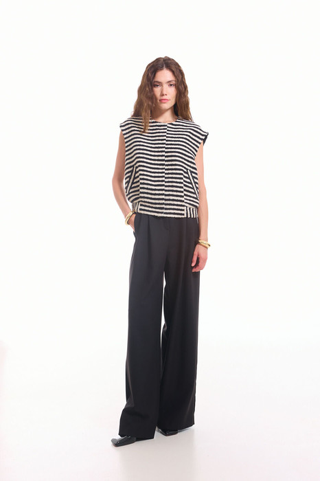 Жилет женский, длиной ниже талии, на подкладке. Перед с прорезными карманами «листочка с втачными концами». По низу притачной пояс на резинке. Жилет с застёжкой на потайные кнопки.
