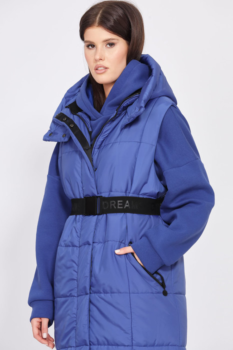Жилет выполнен из матовой плащевой ткани, простеганной с изософтом. Жилет прямого силуэта, длиной миди. Спереди застежка на молнию и кнопки на планке. Карманы прорезные, застегивающиеся на молнию. Спинка со средним швом. Воротник-стойка. Капюшон съемный, крепится на пуговицы. В комплект входит съемный ремень из широкой эластичной тесьмы с пряжкой-карабином. Жилет на притачной по низу подкладке.