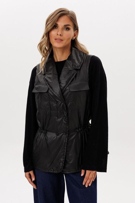 Жилет выполнен из плащевой ткани с утеплителем Isosoft. Жилет полуприлегающего силуэта, длиной до линии бедер. Застежка спереди центральная двубортная на пробивные кнопки. Спереди лацканы,  накладные нагрудные карманы с клапанами и боковые карманы в швах. Спинка цельная. Воротник пиджачного типа. По линии талии настрочена кулиса, в которой протянута эластичная тесьма с фиксаторами. Жилетка на подкладке из основной ткани.