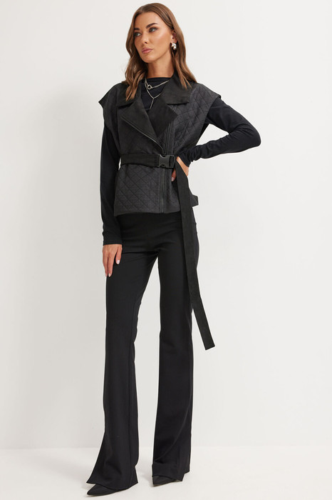 Жилет прямого силуэта из костюмной ткани комбинированной экозамшей. Воротник пиджачного типа с двубортной застежкой. Рукав цельнокроеный. По переду функциональные карманы с листочкой. На спинке дизайнерская вышивка. Жилет на подкладке. Обращаем ваше внимание, что фурнитура может отличаться от фото.