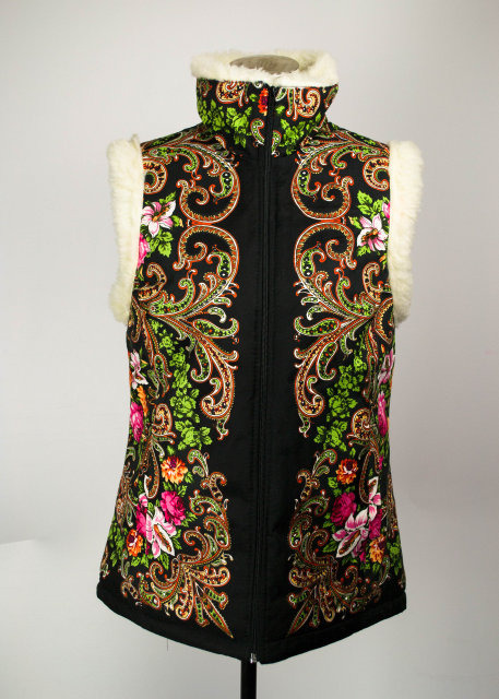 Жилет на молнии с воротником-стойкой, чёрный с рисунком павлопосадского платка.
