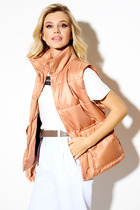 Жилет полуприлегающего силуэта на подкладке. По переду вытачка, переходящая в подрез, функциональный карман. Застежка на петли-пуговицы. По спинке вытачки и хлястик.