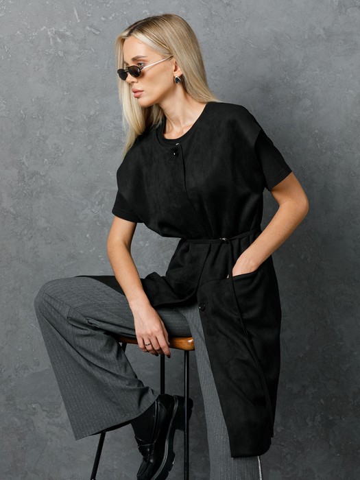 Модель прямого силуэта, со спущенным плечом, без подклада. Застёжка центральная потайная на петли и пуговицы. Спереди в горизонтальных подрезах обработаны карманы. Спинка с кокеткой и средним швом. В боковых швах разрезы. Талия подчёркнута узким поясом с пряжкой.