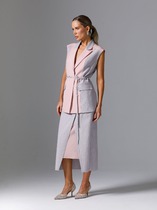 Модель полуприлегающего силуэта, с рельефами и кокетками, на частичном подкладе. Спереди прорезные карманы в рамку с клапаном и центральная потайная застёжка на петли и пуговицы. Воротник английский. Жилет декорирован швами с открытыми срезами.