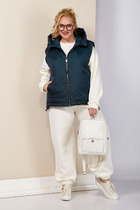 Жилет женский стеганый, прямого силуэта с капюшоном, застежкой на молнию, кокетками и подрезами по переду и спинке, прорезными карманами на молнии, на подкладке. Утеплитель синтепон.