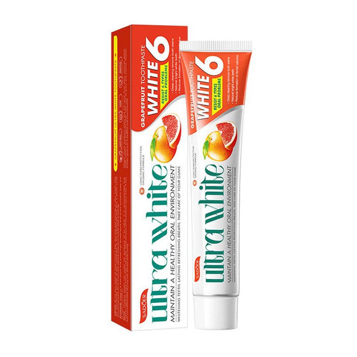 Зубная паста отбеливающая Грейпфрут Sadoer обладает антибактериальным отбеливающим действием. Зубная паста способна проникать в трудные места, избавляет от налета от чая и кофе, сигарет, а также уменьшает риск появления кариеса., Чистите зубы два раза в день, осуществляя профилактику возникновения заболеваний., Способ применения: чистите зубы в течение 2 минут, не реже 2 раз в день, после прополощите водой.