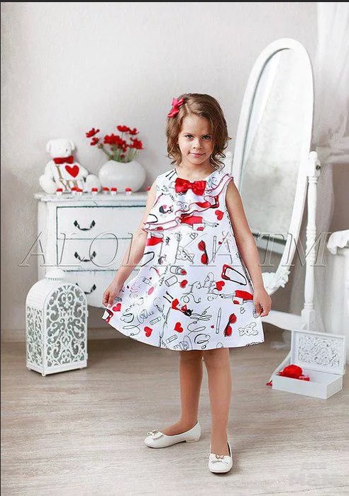 Платье для девочки расклешенного силуэта, выполнено из атласа с оригинальным, современным принтом. По верхней части лифа изделие украшено воланами и атласным бантом, в тон платья. Застежка на потайную молнию на спинке. Этот очаровательный наряд подойдёт как для праздничного мероприятия, так и для прогулок.