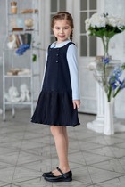 Модель сарафана из однотонной костюмной ткани силуэта трапеции. Нижняя часть сарафана из ткани плиссе. Вырез округлой формы с застёжкой на молнию по среднему шву спинки. Перед сарафана с рельефными швами из горловины. Верхняя часть переда с декоративными пуговицами. Горловина и проймы обработаны внутренними обтачками со стороны изнанки.