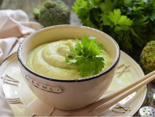 Пюре из сырой брокколи и цветной капусты в пропорции 50/50.
