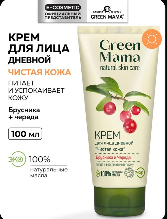 Натуральные растительные экстракты и эфирные масла в составе крема активизируют естественные обменные процессы и усиливают защитные свойства эпидермиса. Череда бережно успокаивает и увлажняет чувствительную кожу в течение дня. Богатая антиоксидантами брусника восполняет нехватку питательных веществ и витаминов, восстанавливая гидробаланс и улучшая микроциркуляцию крови в клетках кожи. Крем прекрасно тонизирует и питает, придает коже лица шелковистость, мягкость и эластичность. При регулярном применении кожа лица приобретает здоровый и сияющий вид. Крем подарит вашей коже ощущение нежности и свежести на целый день. Содержит чистое масло карите - эликсир молодости и натуральную защиту от солнца. Натуральность состава подтверждена экологическим сертификатом соответствия.