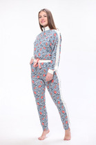 Комплект женский домашний,состоит из трёх предметов: широкий джемпер без нижней резинки с атласной лентой,горловина стойка на молнии. Брюки с высокой посадкой,силуэт прилегающий,в боковых в швах карманы. Для головы имеется подвязка,теперь ухаживать за лицом нашим модницам будет еще удобнее!
