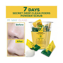 Скраб для глубокого очищения пор с кислотами MAY ISLAND 7 Days Secret Pore Clear Powder Scrub.мягко отшелушивает и удаляет ороговевший слой эпидермиса. Эффективно устраняет загрязнения, излишки кожного сала и черные точки. Содержит очень маленькие абразивные частички и не повреждает гидро-липидный слой кожи. Рекомендуется для проблемной кожи.Способ применения: Распакуйте упаковку со скрабом, нанесите на влажную кожу лица, делайте легкий массаж лица в течении 1-3 минут, особое внимание уделяя T-зоне и проблемным участкам. Умойтесь теплой водой.