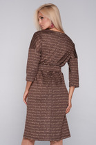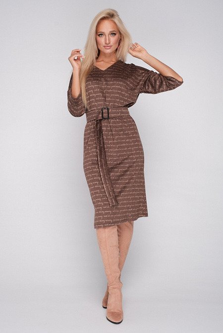 Описание модели: Уютное платье из трикотажного полотна. Модель свободного силуэта, подойдет на любой тип фигуры. По переду V-образный вырез горловины, рукав 3/4. Пояс идет в комплекте.