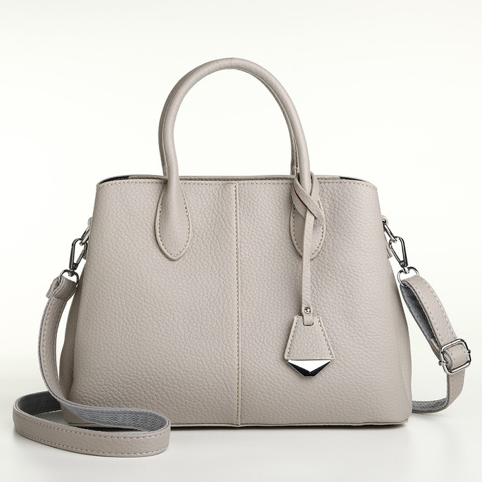 Сумка оснащена прочной молнией и имеет жесткий каркас, что обеспечивает сохранность ваших вещей. Благодаря длинному ремешку и коротким ручкам, вы сможете носить ее как на плече, так и в руке, что добавляет дополнительного комфорта. Серый цвет и серебряная фурнитура придают аксессуару свежий и современный вид, делая его подходящим для любого сезона.