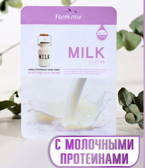 Благодаря входящему в состав средства, предназначенного для пропитки материи, экстракту молока, кожа великолепно очищается и тонизируется, увлажняется и питается. Многие отмечают, что после регулярного применения Visible Difference Mask Sheet Milk пигментные пятна и веснушки становится гораздо светлее и незаметнее.Входящие в состав экстракта молока лактоферменты оказывают на кожу регенерирующее воздействие, а аминокислоты деликатно удаляют омертвевшие клетки, тем самым выравнивая цвет лица и замедляя процесс старения. Также в составе тканевой маски для лица с молочными протеинами содержатся такие вещества, как бетаин, гиалуроновая кислота и аргинин. Достаточно регулярно применять данное косметическое средство от Farm Stay для того, чтобы достичь должного эффекта.