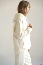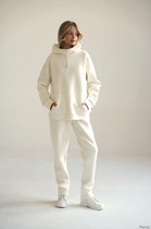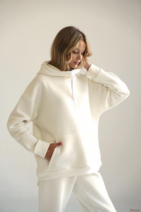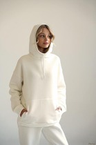 Толстовка женская из футера с начесом. Выполнена из натуральных материалов с добавлением синтетических нитей, ворсовой слой с изнанки создает согревающий слой. В тёплое время года используется как верхняя одежда, в холодное время года толстовку можно носить в качестве второго слоя одежды (для утепления). Удобный капюшон с высокой стойкой на завязках, как дополнительная защита от ветра и холода. Длинные рукава на манжете,а также низ изделия на притачном поясе. Спереди удобный карман кенгуру. Данная модель может приобретаться костюмом или комбинироваться с различными спортивными штанами, утепленными лосинами, юбками, джинсами и др.