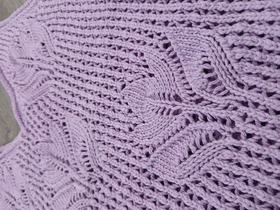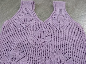 Сиреневая майка с узором из переплетенных стеблей и листьев. Изготовлена из хлопка с добавлением акрила для комфорта и долговечности. Размер XS (40). Длина изделия — 44 см; ширина — 32 см. Подходит для повседневного ношения.