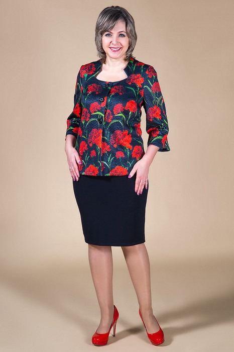 Стильный, элегантный жакет – идеальное решение для любого случая. Выполнен из высококачественного полотна польского производства, с модным актуальным принтом «гвоздики на чёрном» Фигурный вырез горловины. Рукав втачной 3/4. Спереди притачная планка на пуговицах.
